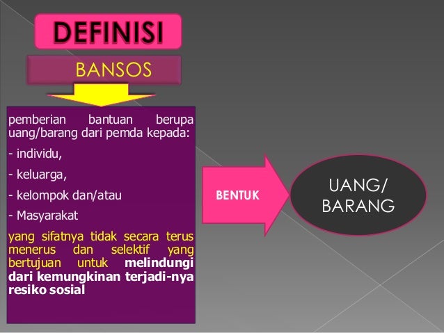 10 hanya pada risiko sosial yang berbeda dengan definisi yang dinyatatakan dalam PMK No. Pengertian bantuan sosial dapat dibaca di dalam Permendagri Nomor 32 Tahun 2011 tentang Pedoman Pemberian Hibah dan Bantuan Sosial yang Bersumber dari APBD sebagaimana diubah dengan Permendagri Nomor 39 Tahun 2012 pasal 1 angka 15 Bantuan sosial adalah pemberian bantuan berupa uangbarang dari pemerintah daerah kepada individu keluarga kelompok danatau masyarakat yang sifatnya tidak secara terus menerus dan selektif yang bertujuan untuk melindungi dari kemungkinan terjadinya resiko.