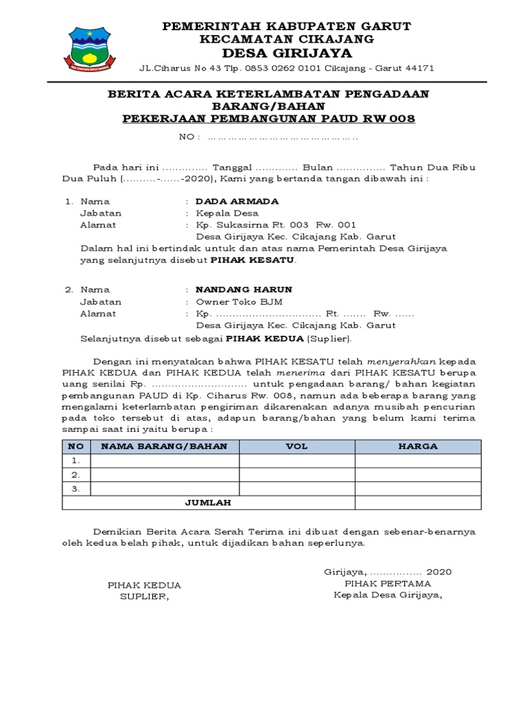 Berita Acara Keterlambatan Pengiriman Barang Docx